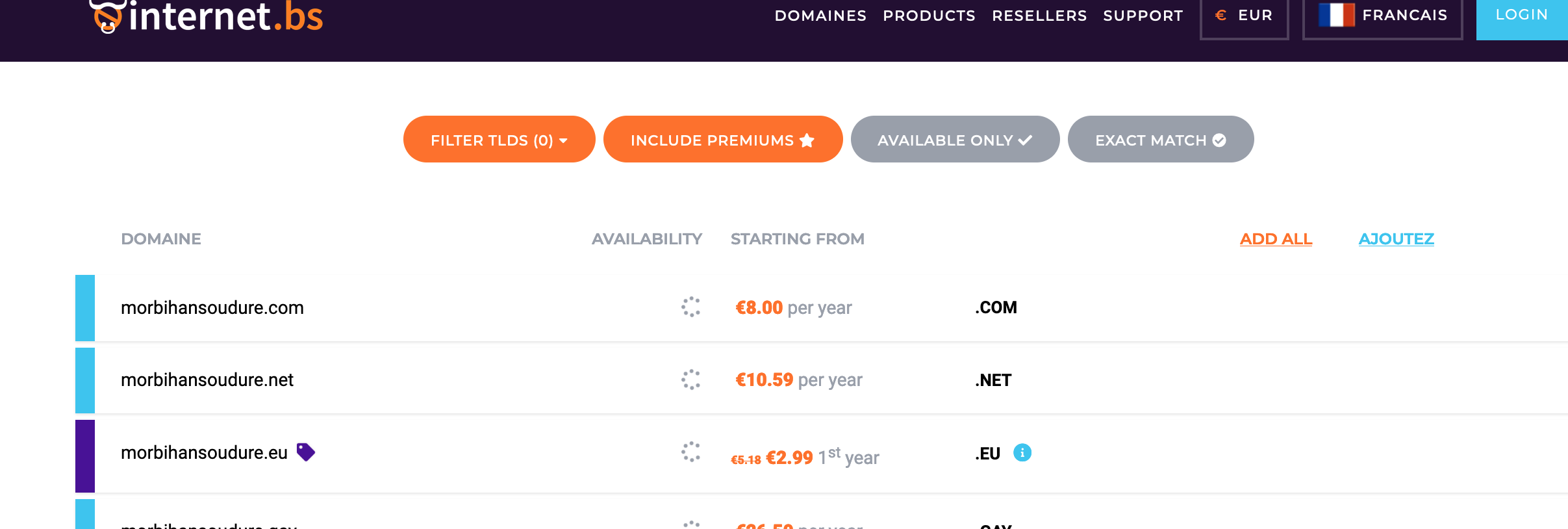 Il existe plusieurs sites, notamment d’hébergement, qui proposent parallèlement de réserver et d’acheter un (ou plusieurs) nom(s) de domaine(s). Pourtant, une plateforme spécifique est selon nous très intéressante. Il s’agit de Internet BS. Internet BS vous renseigne vite et bien sur la disponibilité du nom de domaine que vous souhaitez choisir. Vous avez également une idée du prix du nom de domaine que vous convoitez. Si par exemple vous exercez en tant que soudeur dans le département breton du Morbihan, et que vous envisagez (immédiatement ou plus tard) de lancer un site web pour valoriser votre métier et vos services, regardez comment Internet BS vous avertit :